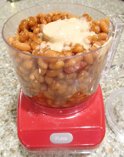 Add the can of beans, little less than 1/4 cup of the tahini (side note: the first time I made this I didn’t have any tahini & it still worked fine), little bbq sauce & any other item you want to give it flavor to the food processor.